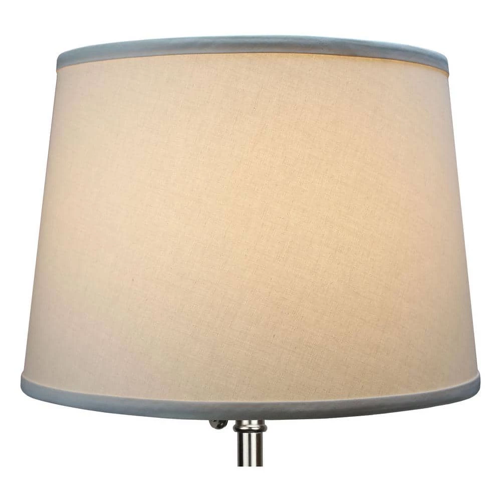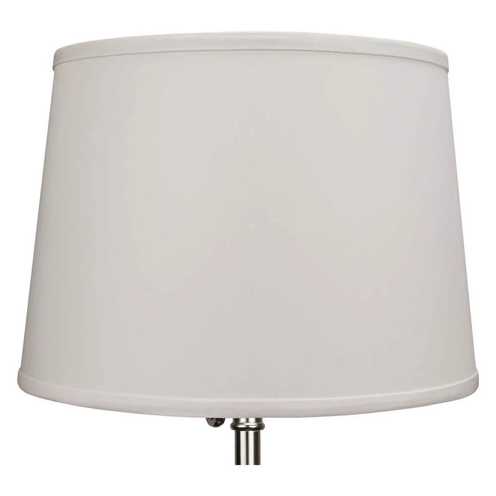 This Fenchel Shades lamp shade has a top diameter of 12 in., a bottom diameter of 14 in. and a slant height of 10 in. This attachment is called a washer attachment and is nickel in color. It is also known as a spider attachment. If your lamp has a harp, then you will generally need a washer attachment. The inner-dimension of a washer attachment measures slightly over 1/2 in.