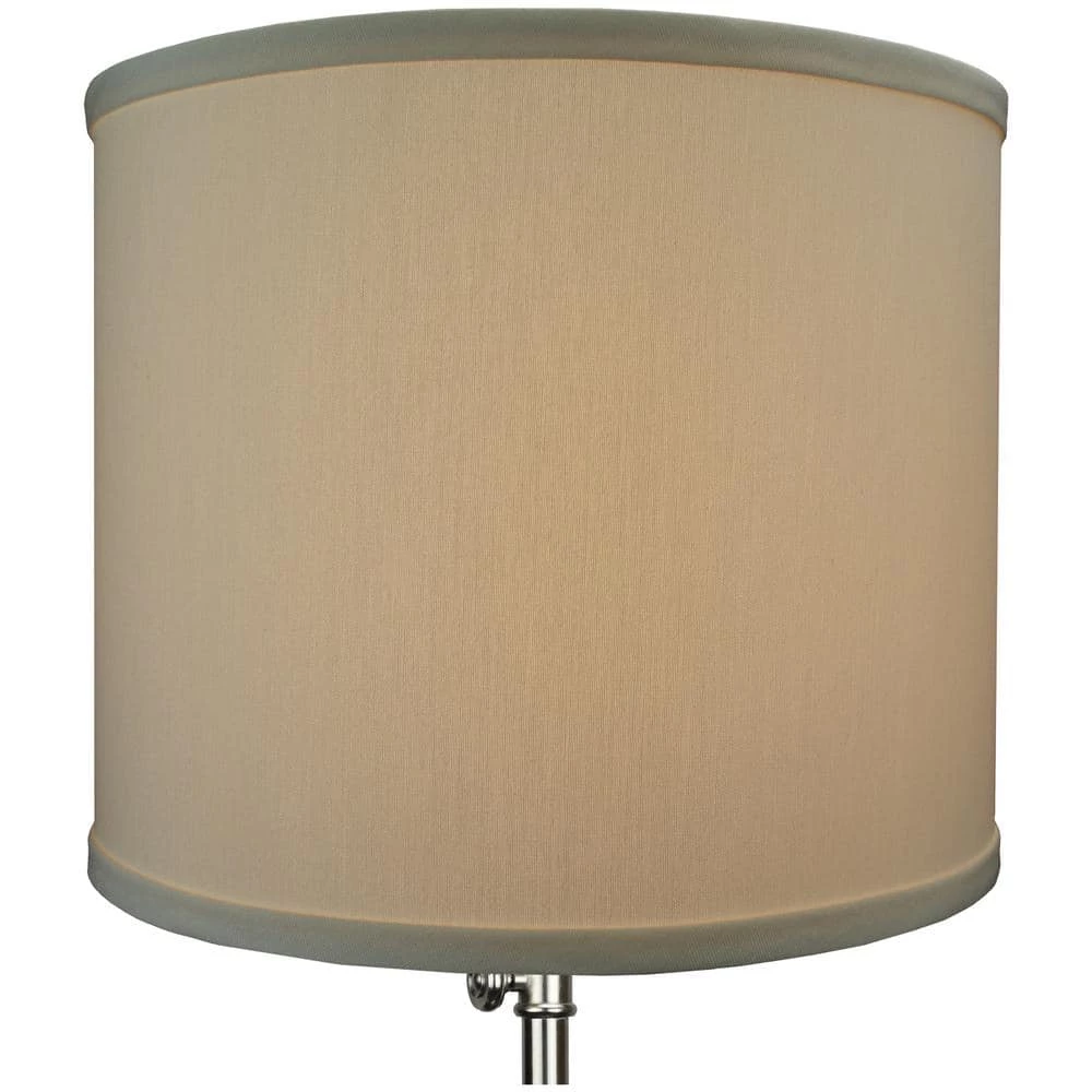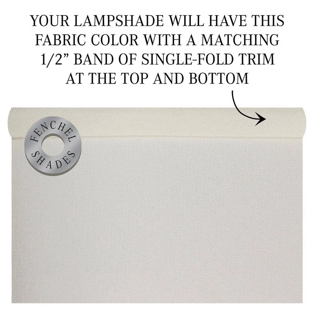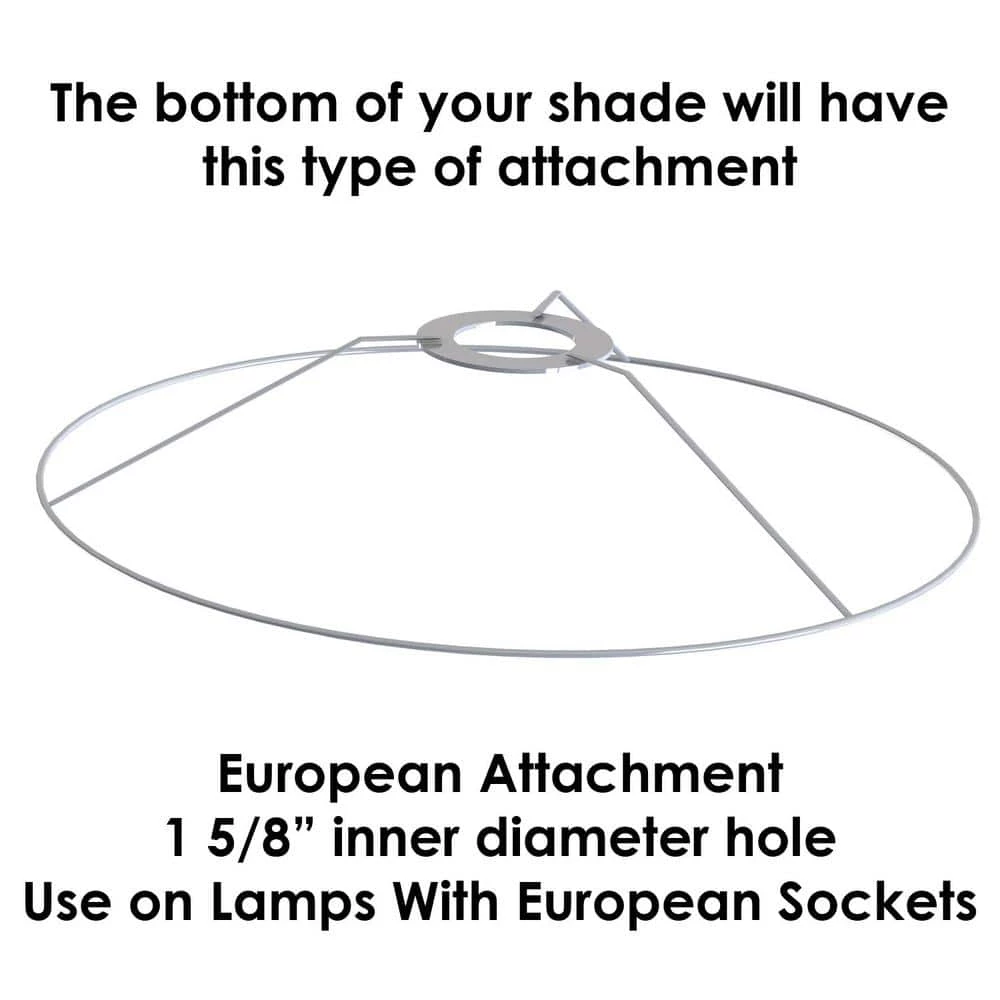 This Fenchel Shades lamp shade has a top diameter of 12 in., a bottom diameter of 12 in., and a slant height of 10 in. The attachment type is a European style. It is like an Uno fitter, except the inner dimension of the ring measures 1-9/16 in. The European fitter generally resembles a large, flat washer, with the thickness of a penny. The European fitter slips on to the socket, and then a plastic or metal cap gets screwed on to hold the fitter in place. The European-style fitting is becoming more and more popular. This attachment is connected to the bottom of the lampshade. It rises 2 in. above the lamp shade bottom.