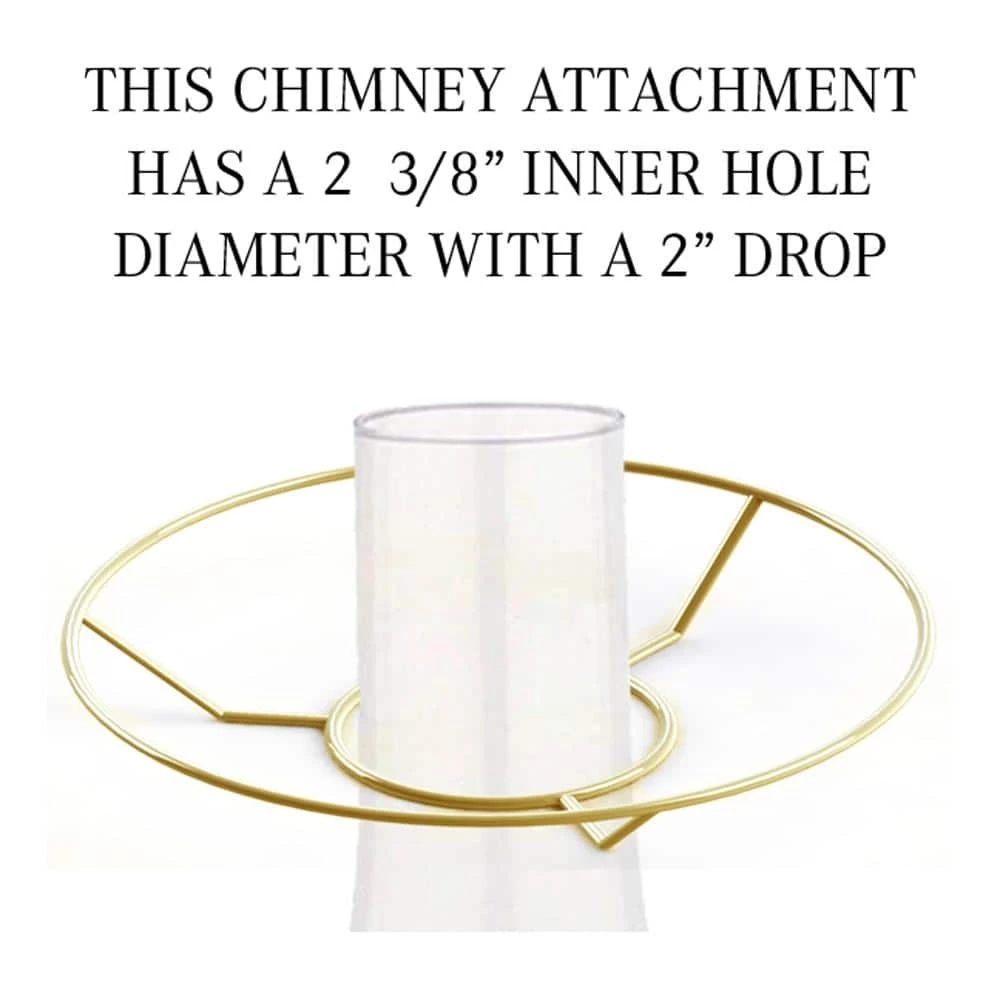This Fenchel Shades lamp shade has a top diameter of 5 in., a bottom diameter of 12 in., and a slant height of 8 in. The attachment type is a Chimney fitter, also referred to as a hurricane fitter. It is not very common anymore, but is necessary if you have a lamp requiring a chimney. Generally, antique lamps especially oil lamps (hurricane lamps) require the chimney fitter. The chimney fits directly over the glass opening at the top of these kinds of lamps. The inner diameter of a standard chimney fitter is 2-3/8 in. This particular chimney attachment has a 2 in. drop, meaning the ring attachment sits 2 in. below the top of the lamp shade.