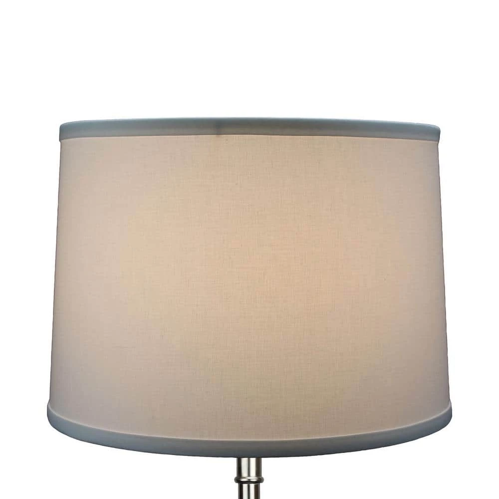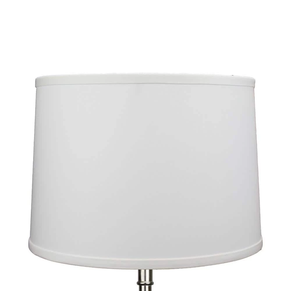 This Fenchel Shades lamp shade has a top diameter of 13 in., a bottom diameter of 14 in., and a slant height of 10 in. This attachment is called a washer attachment and is nickel in color. It is also known as a spider attachment. If your lamp has a harp, then you will generally need a washer attachment. The inner-dimension of a washer attachment measures slightly over 1/2 in.